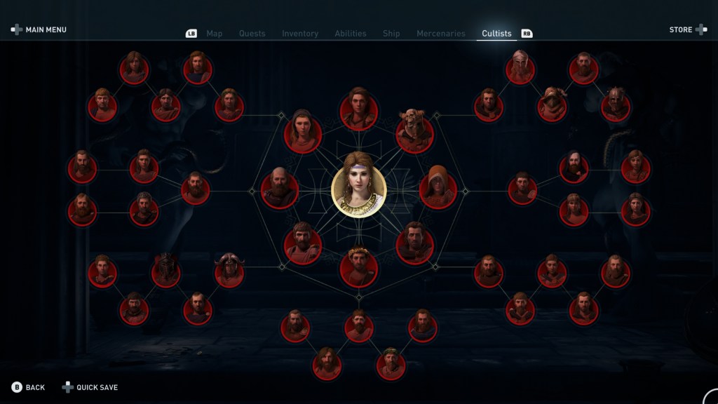 Viszont Alexios elgondolkodik, hogy vajon miért akarták megöletni vele a saját apját. Kis nyomozás után kiderült, hogy a megbízója egy szektának, a Cult of Kosmos-nak a tagja. Ez, ha jól számolom, már a negyedik cselekmény-szál. Kiderül, hogy a szekta mozgatja a szálakat Görögország-szerte, kényszerítik az orákulumokat, hogy hamis jóslatokat adjanak az embereknek, ezzel elősegítve a terveik megvalósulását. Ráadásul ki akarják irtani Alexios családját. Hősünk ezért megesküszik, hogy felszámolja a szektát. Ami persze nem könnyű, ugyanis a szektások kiléte nem ismert, személyüket felfedni csak a fő küldetés során, valamint mellékNem elég, hogy Alexios egy világuralomra törő szektával találja szemben magát, de döbbenetes felfedezést is tesz: a szekta egyik hadvezére és hatékony fegyvere nem más, mint halottnak hitt húga, Kassandra (aki Deimos néven fut már).