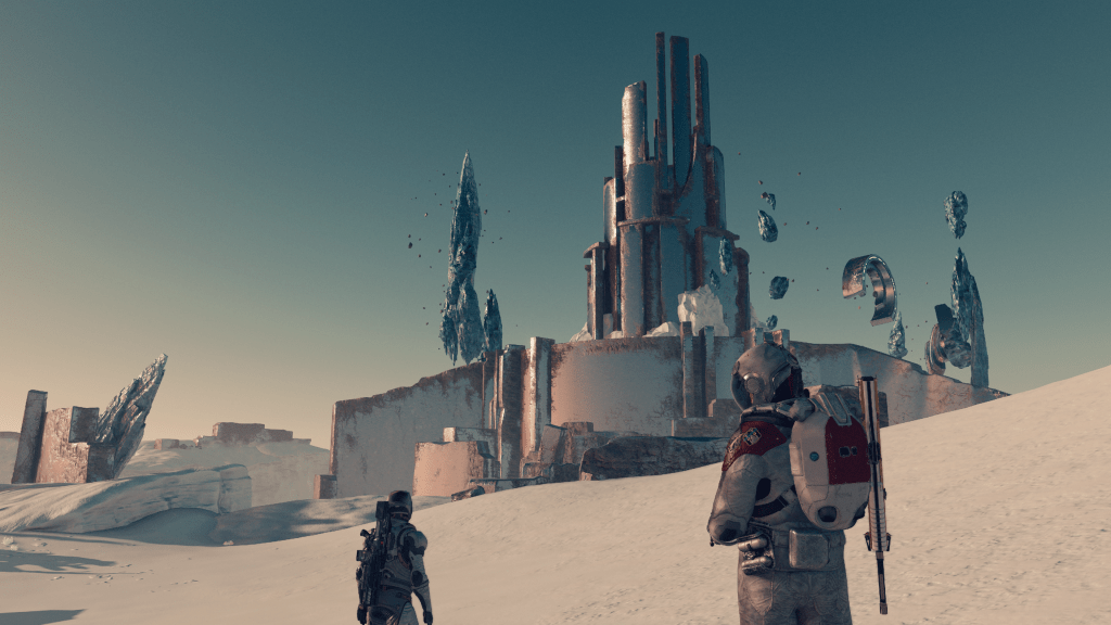 Szépen kidolgozott, hatalmas open world tájakat tár elénk a játék, rengeteg bolygón mászkálhatunk, majdhogynem határok és korlátok nélkül. A „szépen kidolgozott” jelzőt használom, mert úgy gondolom, hogy kicsit elmarad az Elden Ring csodaszép és mesés tájképétől – viszont, mivel ekkora hatalmas teret ölel fel a játék, talán nem is véletlen, hogy minden bolygó minden apró kis szegletét nem lehet tökéletesen megrajzolni. Sajnos belátom, helyenként kifejezetten csalódást keltő egy két eleme a világnak (például a növényzet helyenként egészen meglepően elnagyoltnak hat).