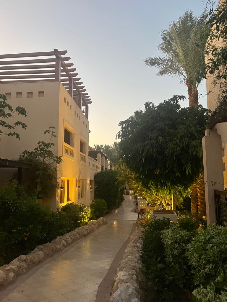 Ebéd után jöhetett, hogy elfoglaltuk a szobát. Az sem volt egy könnyű menet. A recepción a becsekkolás pillanatok alatt megtörtént, azonban meg kellett várni, hogy a szálloda egyik alkalmazottja elkísérjen a szobához, míg a bőröndöket ott kellett hagyni, hogy majd azt egy másik alkalmazott utánunk hozza. A 108-as számú szobát kaptuk, ez számomra azt mondta, hogy az első emeleten lesz majd a szobánk. Hát nagyon tévedtem. Mint kiderült, a főépületben csak egy-két nagyon komoly luxuslakosztály található, a normális szobák nem a főépületben vannak. Arra jó volt a vezetés, hogy megismertük kicsit a szállodát. A lobby alatt egy szinttel volt egy nagy bárterasz, és onnan lefelé (a tenger felé) még 4 szinten medencék és minden szinten különálló, egy emeletes, arab stílusú kockaházak, első ránézésre (és aztán sokadikra is) teljesen véletlenszerű elrendezésben. A házak között kis utcácskák, lépcsők vezettek. Ha az ember nem figyelt, egészen simán el lehetett tévedni. Mindenesetre nagyon hangulatos, növényekkel beültetett, este kivilágított kis utacskák között kavarogtunk, mire odaértünk végre a szobánkig.